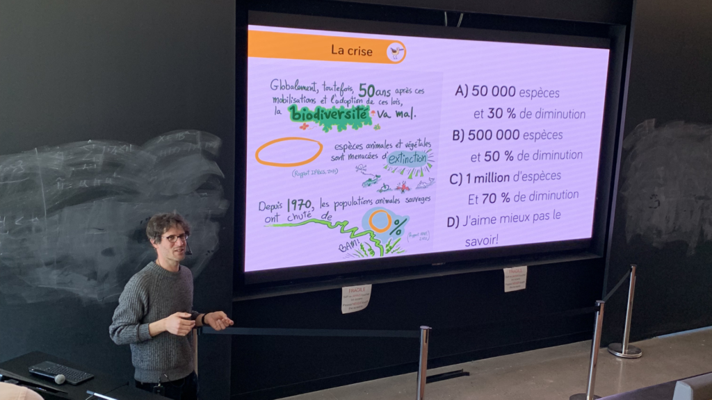 Le biologiste et bédéiste Martin Patenaude-Monette [PM] est venu jouer son rôle de vulgarisateur scientifique le 18 mars dernier pour la Semaine des objectifs de développement durable (ODD) de l’Université de Sherbrooke (UdeS). Sa conférence Comprendre et agir pour la biodiversité grâce à la BD prenait place entre les murs de l’auditorium de l’Institut quantique.