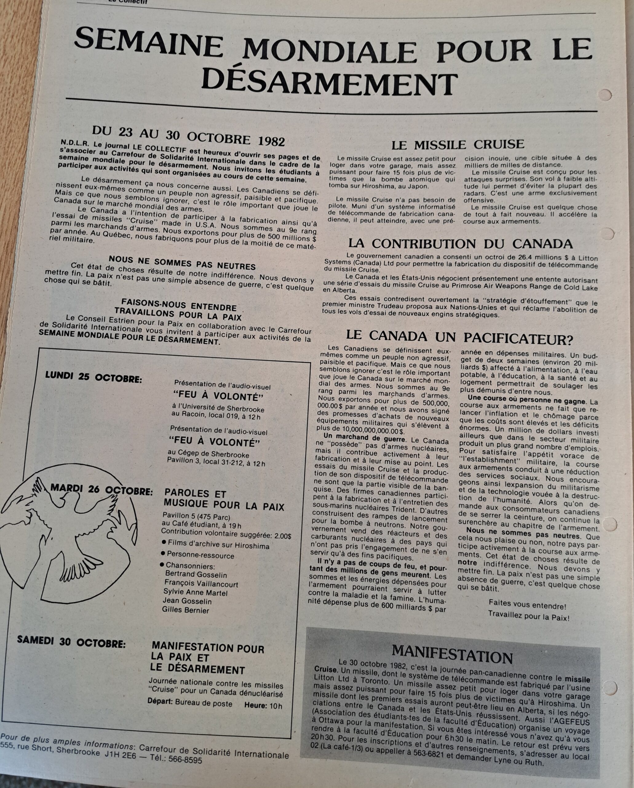 En 1982, Le Collectif répond à cette proposition et accorde une page entière à cette semaine mondiale du désarmement. Divisée en deux sections, la première partie de l’article informe la population étudiante des différents évènements prévus lors de la semaine. Ces évènements incluent des manifestations, la projection d’un documentaire, ou encore une soirée musicale. Le Collectif s’associe au Carrefour de solidarité internationale pour l’organisation des activités et de la manifestation pour la paix et le désarmement. La deuxième section de la page contient, quant à elle, de l’information sur les enjeux liés au désarmement. Le missile Cruise, la contribution du Canada à l’armement, ainsi que la dénonciation de l’image d’un « Canada pacificateur » sont les points principaux abordés dans l’article. On peut y lire la position étudiante : « Nous ne sommes pas neutres […] Travaillons pour la paix ». En résumé, l’enjeu du désarmement appelle à la mobilisation étudiante, comme en témoigne l’action du Collectif à l’Université de Sherbrooke dans les années 1980.