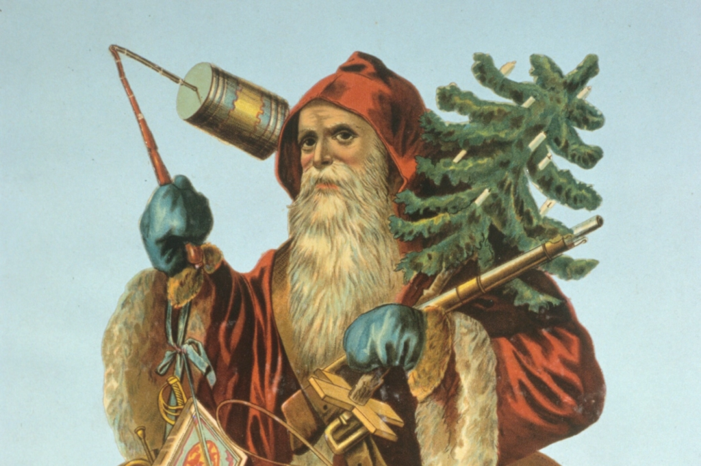 Sur cette carte du 19e siècle, le père Noël est chargé de cadeaux et porte un sapin de Noël illuminé par des bougies.