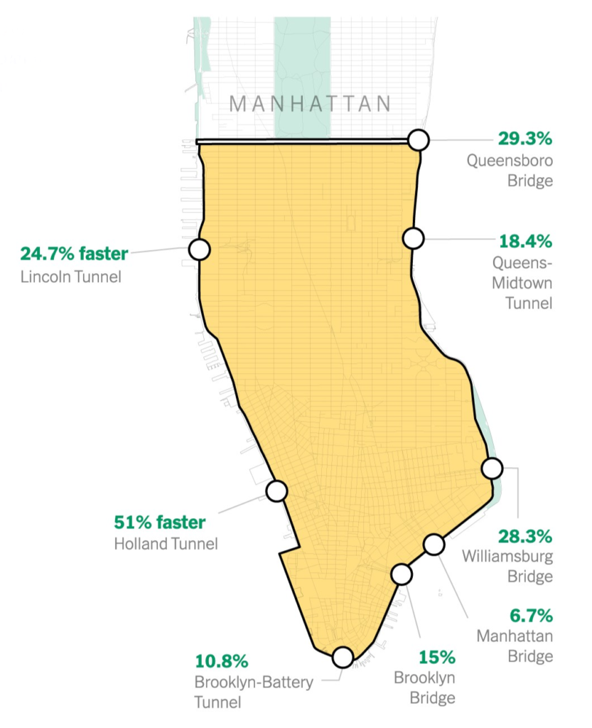 La circulation est maintenant beaucoup plus naturelle pour les automobilistes et les autobus. Selon les données, la fluidité de la zone de congestion aurait augmenté de 4,5 %, contrairement à 1,4 % pour le reste de la ville. D’ailleurs, voici les ponts et tunnels où la vitesse aurait le plus grimpé : le tunnel Holland (51 %), le pont Queensboro (29,3 %), le pont Williamsburg (28,3 %) et le tunnel Lincoln (24,7 %).